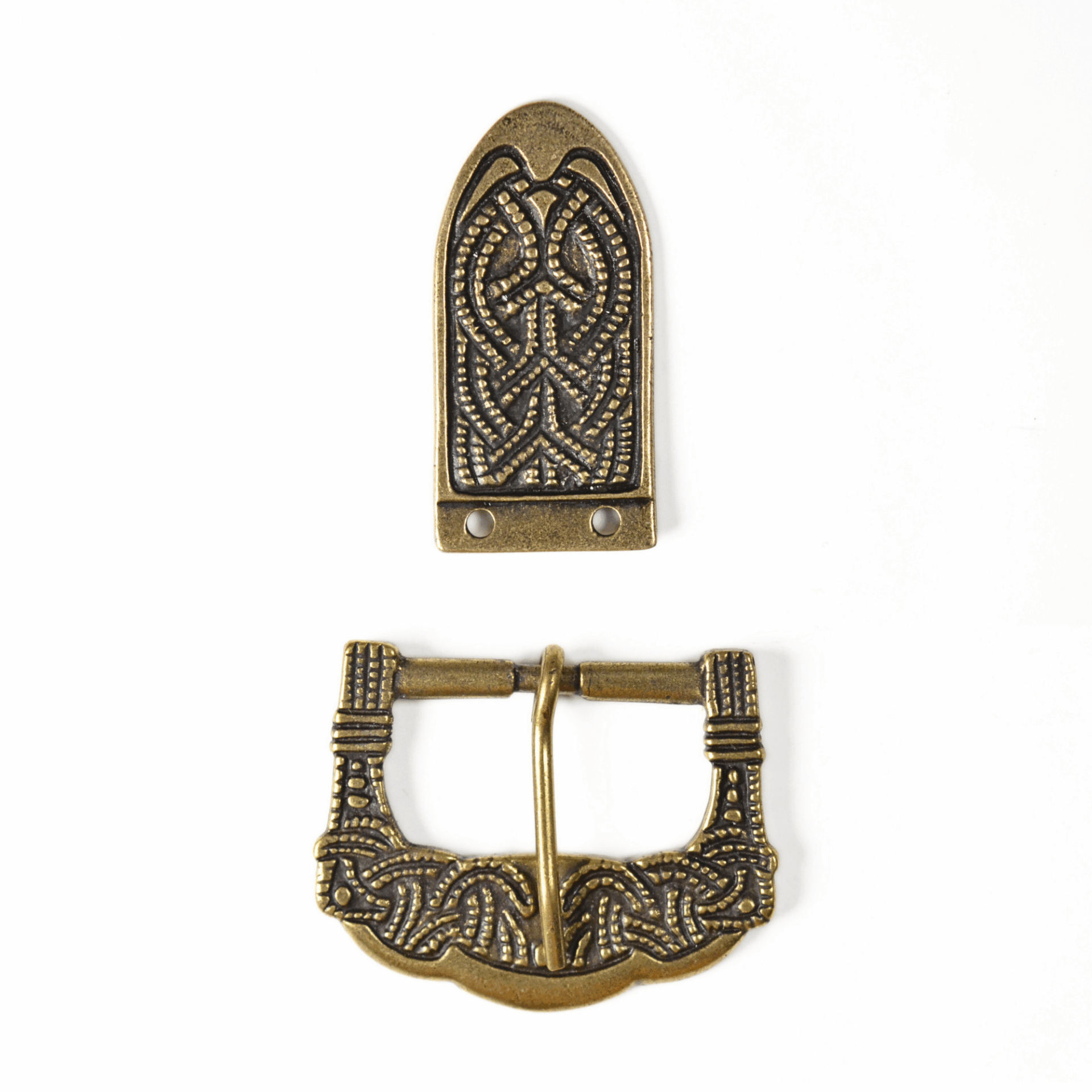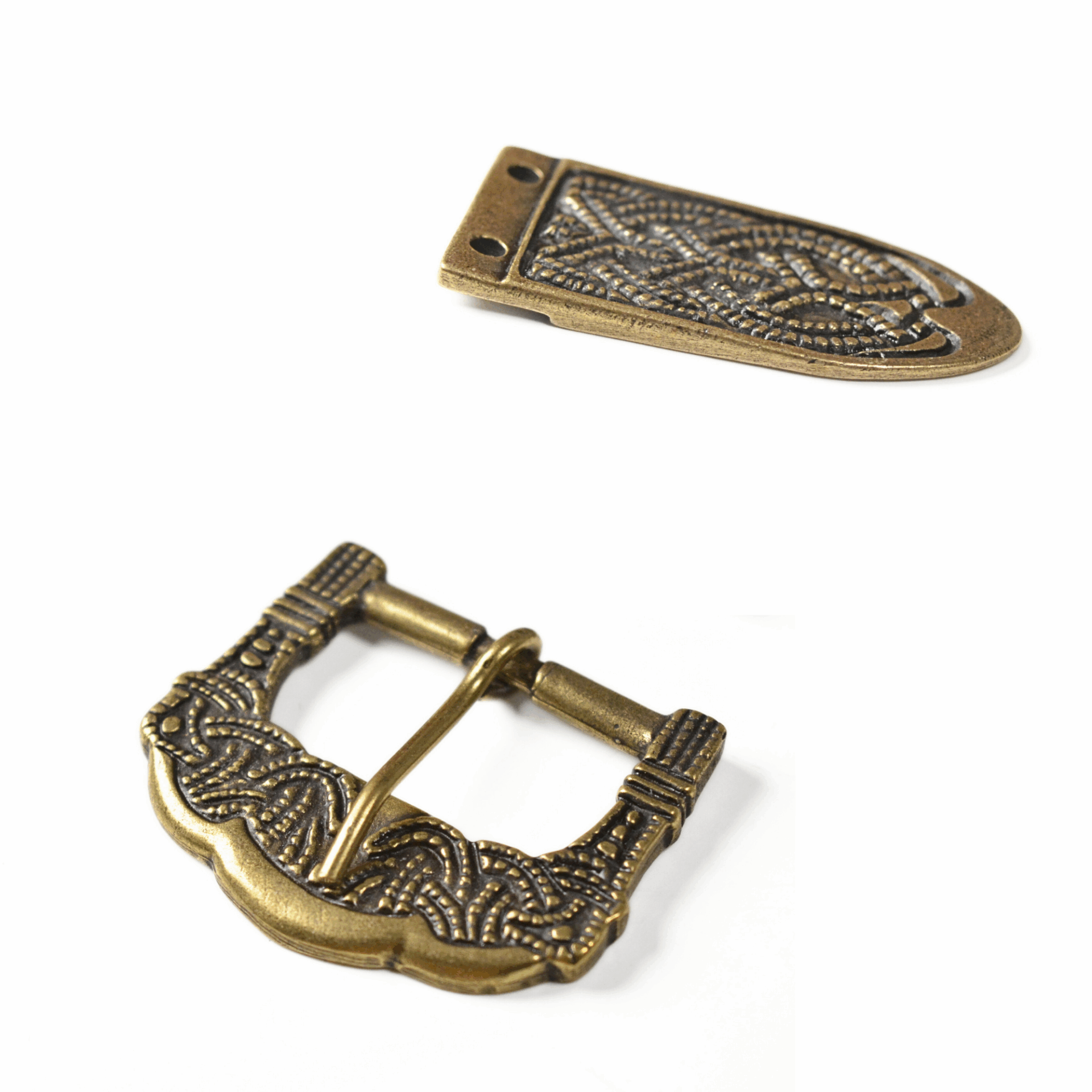Cette boucle et ce bout de ceinture sont des reproductions d’un ensemble original viking. L’ensemble de la ceinture originale a été découvert en 1890 dans un monticule près de la ferme de Gokstad (Sandar, Norvège). Cette tombe, très riche en artefacts, incluait des tentes, des équipements pour chevaux et des bateaux. Il est suggéré que ce monticule appartenait au roi nordique Olaf Geirstad-Alf, le roi de Vestfold.