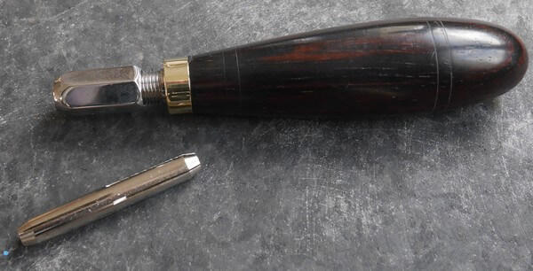 Manche en bois et bague laiton. Le système est en inox vous garantissant contre les problèmes d’oxydation.