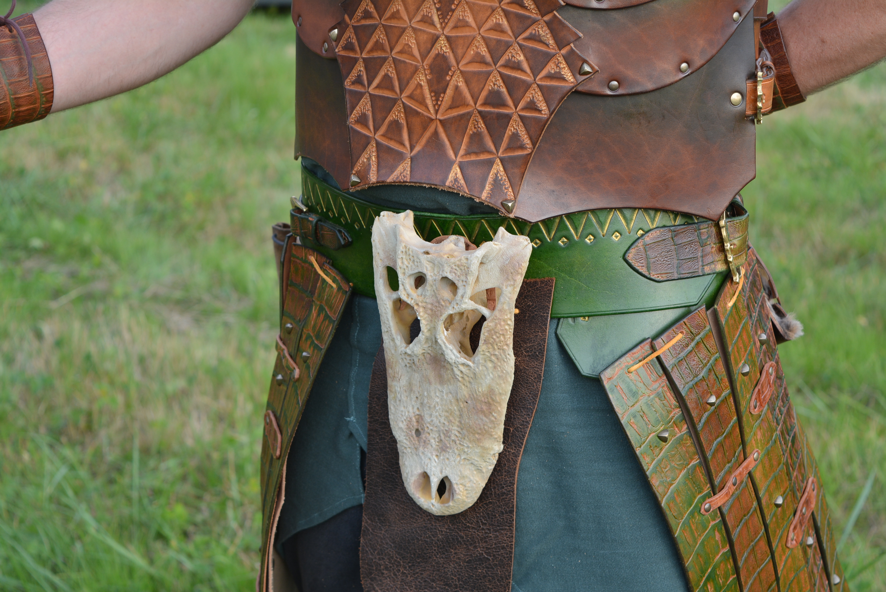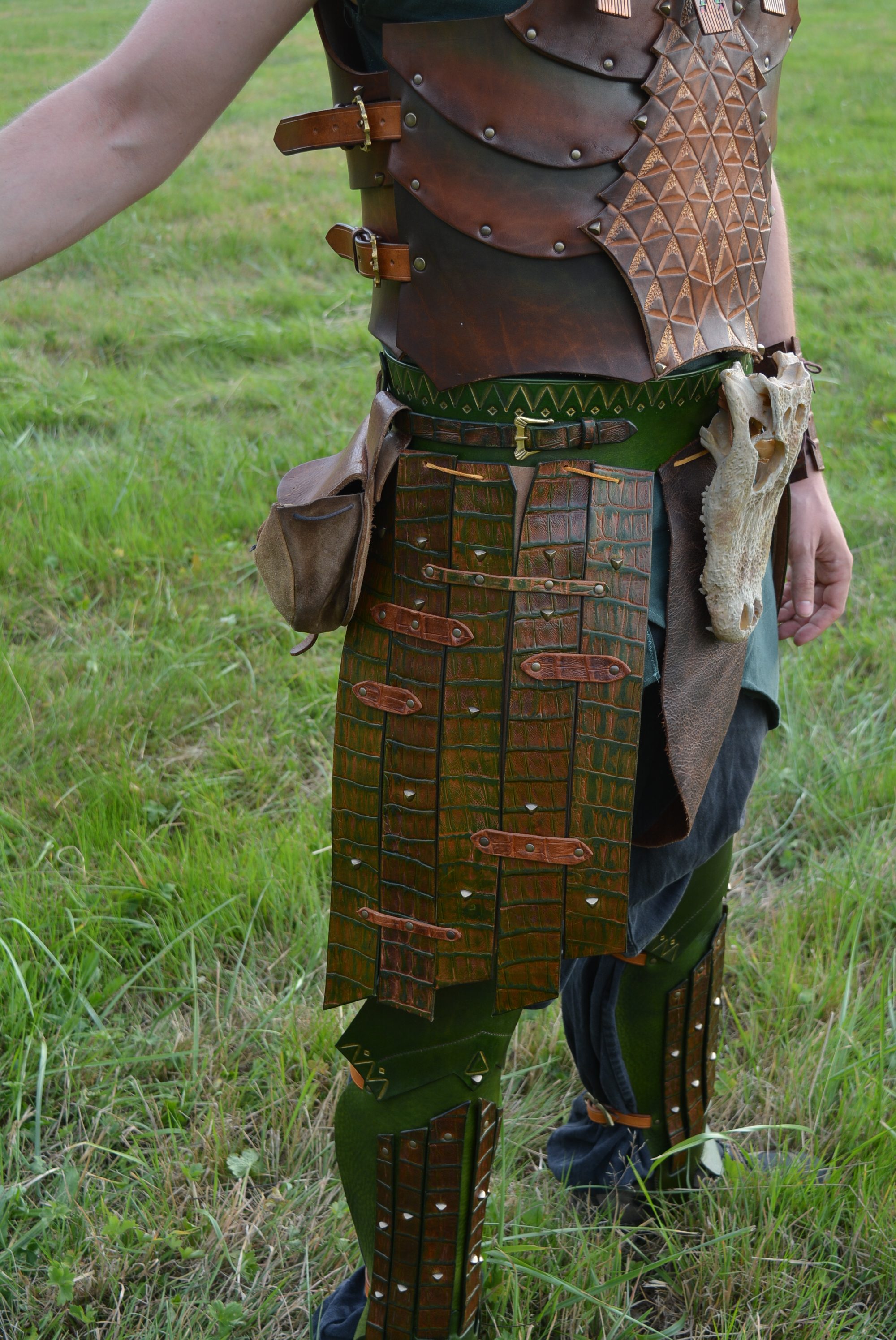 Cette armure est en cuir tannage végétal naturel des tanneries Radermecker et De Chamont. Et du cuir embossé imitation crocodile a également été utilisé. Ainsi qu’un peu de cuir foulonné pour les grèves.